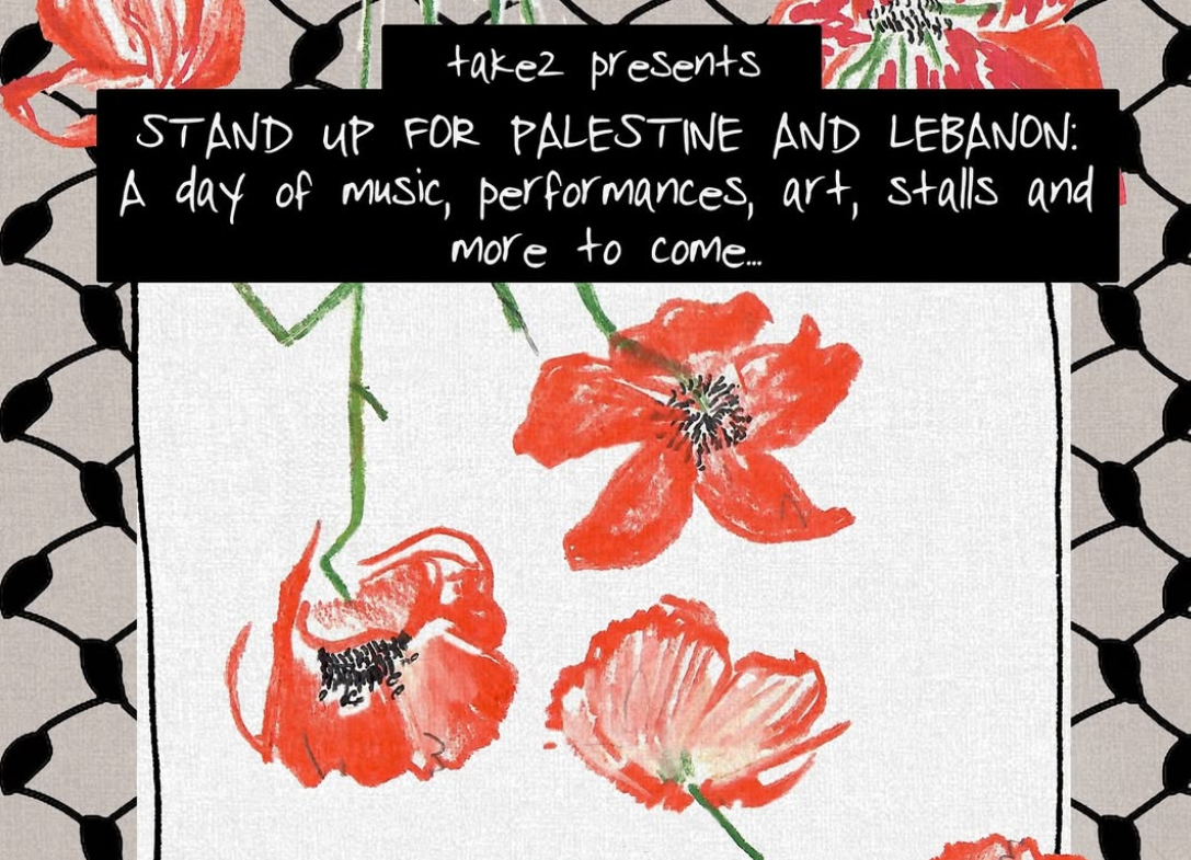 Take2 presents: A festive fundraiser. Our day to night event will include food from Cafe Palestina, music, workshops and more. All proceeds will go to MAP and Maalak, charities working to support the displaced people of Palestine and Lebanon.